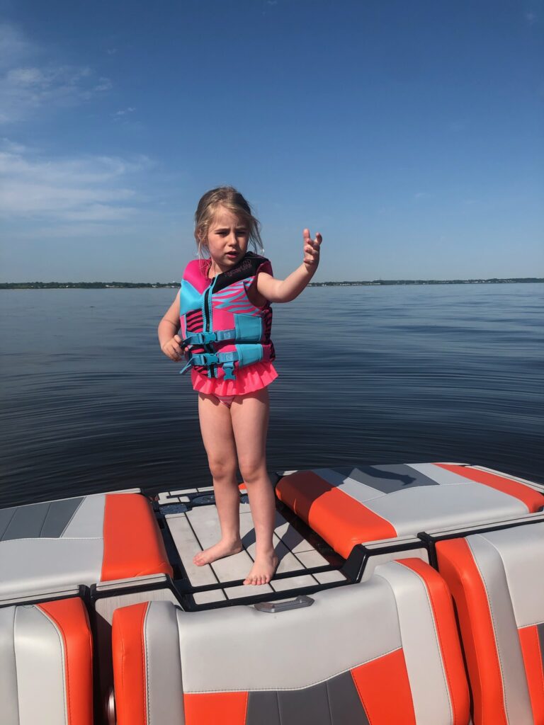 First week of the 2024 season. Fiametta surfed with a bit of assistance, gave us speeches, and jumped of… the….top…..rope! Fiametta was the first one to offer to help daddy put the boat in the water for the season’s maiden voyage. She PROMISED she would sit down and stay put when I asked her to. Daddy knew she meant business and would be a great help so off to the boat ramp we were headed. Sienna emerged from out of nowhere in the front door “WHOAAAA, where are you guys going?” Sienna wanted to help too. With the whole family off to the boat ramp even Mommy didn’t want to miss out on the action and the whole family set off. The boat went in with our amazing crew flawlessly and we left it in and played all week long.